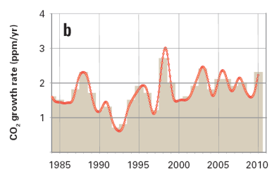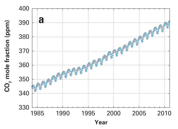 Il y a quelques semaines, l’organisation météorologique mondiale (OMM) a publié son rapport officiel pour l’année 2010. Le bilan scientifique constate qu’entre 2009 et 2010, la concentration de gaz carbonique dans l’atmosphère a augmenté de 2,3 ppm, une hausse plus importante que la moyenne de la décennie 2000-2010, établie à 2,0 ppm/an. La hausse moyenne des années 1990 était de 1,5 ppm/an.